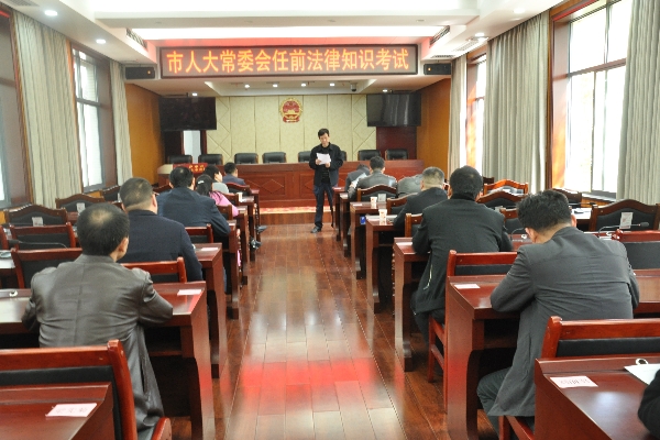 3月25日下午,《人事任免办法》实施后的首场任前法律知识考试在市人大常委会三楼会议室进行,此次考试对象是机构改革后拟提请人大常委会任命的政府办主任、政府工作部门的局长、市检察院副检察长,此次考试采取闭卷形式,考试内容主要包括宪法、监督法、代表法、行政许可法、行政处罚法等,试题结合了拟任人员的岗位实际,注重理论与实际相结合,以达到以考促学的目的。