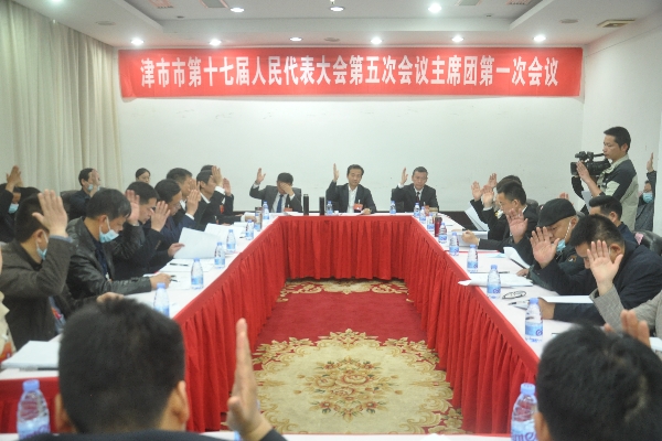 4月24号下午,津市市第十七届人民代表大会第五次会议在市兰苑宾馆会议中心举行大会主席团第一次会议。